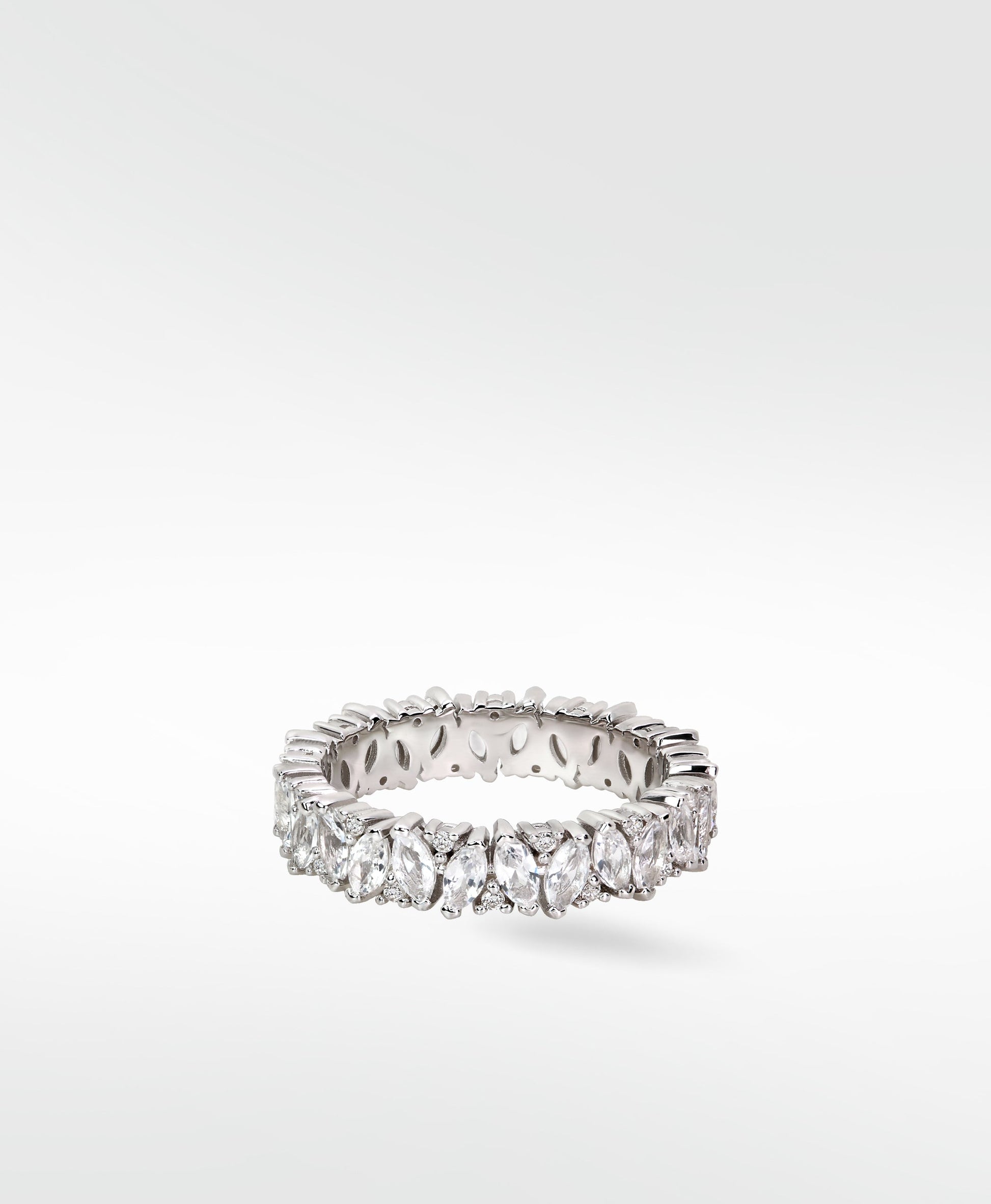 A ring featuring lab-created diamonds and a dazzling array of cultured sapphires to elevate their style with a touch of chicness. A luminescent celebration of life and hope set on silver in various sizes with white rhodium plating, traditional craftsmanship combined with the cutting-edge tech of creating gemstones. A portion of each sale will be donated to support fertility research and those facing related challenges.